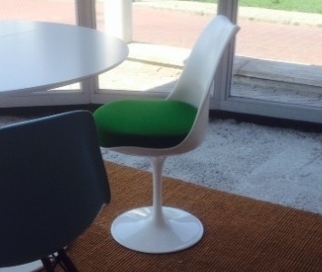 Tulp chairs van Eero Saarinen met een voet in aluminium, wit hoogglans gecoat, autostop tegen het doordraaien van de kuip, glasvezel kuip in satijn wit of zwart en kussentje in kleur naar wens maar ook in leer of zelf aan te leveren stof.
