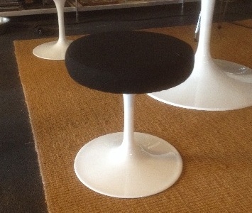 Tulp krukje van Eero Saarinen voor aan tafel, aluminium voet hoogglans wit, grijs of zwart gecoat, draaibaar, bekleding in vele kleuren stof maar ook met eigen stof en leer geen probleem.