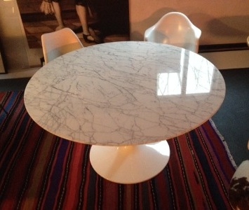 Een blad in Italiaans Arabescato marmer. Dit marmer heeft een wat sterkere ader en is met een gepolijst of met een mat oppervlak verkrijgbaar. De bladen zijn behandeld en ook deze tafel kunnen wij op maat in rond en ovaal leveren.