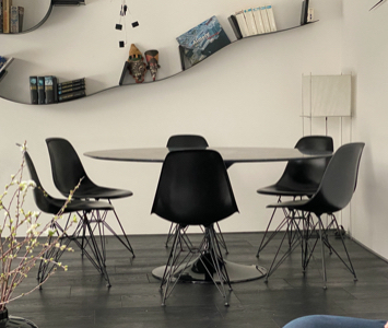 Fraaie combi van de Tulp tafel in zwart Spaans Marquina marmer in combinatie met de Glasvezel DSR stoelen van Charles Eames met zwarte Eiffel base.